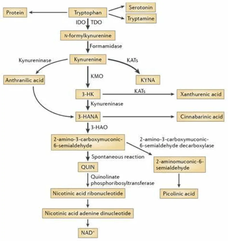 The de novo synthesis of NAD+ primarily depends on the kynurenine pathway (KP), although NAD+ can also be recycled from nicotinic acid (NA), nicotinamide (NAM), and nicotinamide riboside (NR). In mammals, NAD (Nicotinamide Adenine Dinucleotide) + is synthesized from either tryptophan or other vitamin B3 intermediates that act as NAD+ precursors [1]. Tryptophan is an essential amino acid that cannot be produced by the human body and must be obtained through your diet, primarily from animal or plant-based protein sources. Discovered in the early 1900s after isolation from casein, a protein found in milk, its molecular structure was determined shortly after. Tryptophan, despite being the least concentrated amino acid in the body, plays a crucial role in various metabolic functions impacting mood, cognition, and behavior. Tryptophan elimination experiments have demonstrated its beneficial influence on mood, depression, learning, memory skills, visual cognition, and aggression control [2].