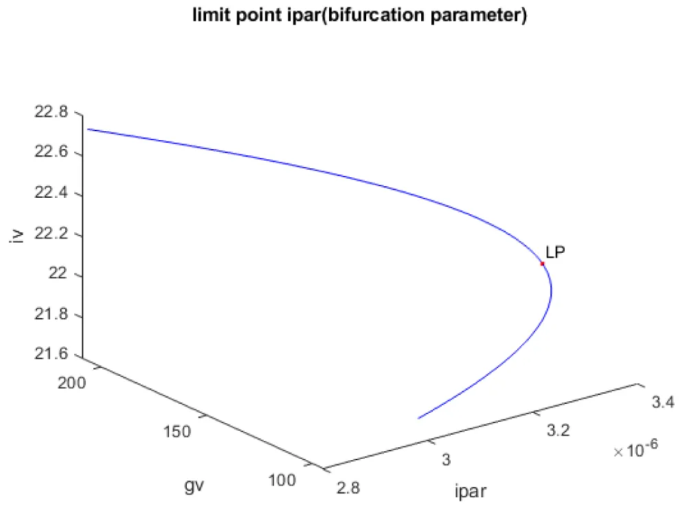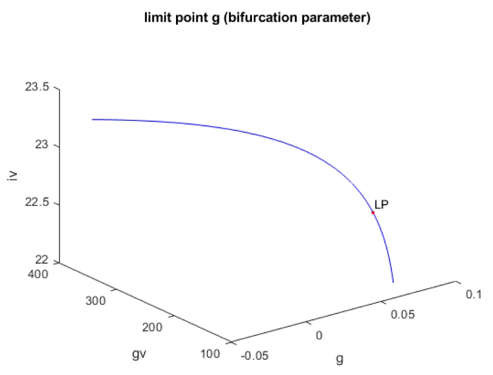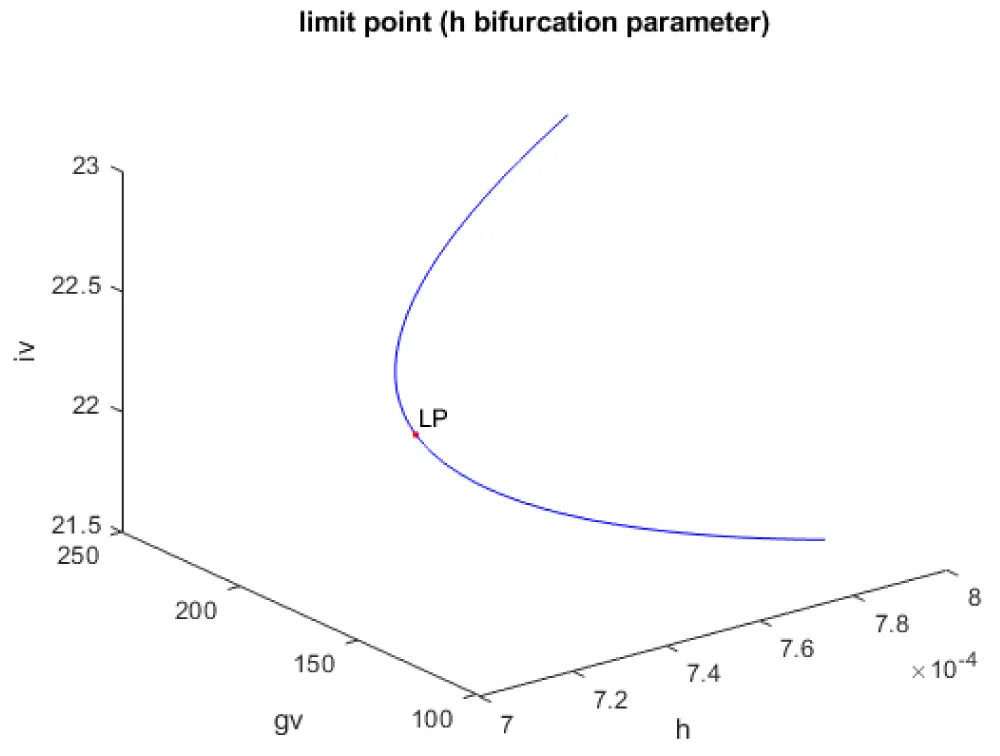Kumari, et al. [20] show that when g, h, and ipar were the bifurcation parameters, the model exhibits limit points. This result is confirmed and reproduced. When g was the bifurcation parameter, a limit point was found at (gv, iv, β, g) values of ((175.000002 22.515503 372.195048 0.073500)(Figure 1a). When h was the bifurcation parameter, a limit point was found at (gv, iv, β, h) values of (148.262155 22.303139 425.956300 0.000712) (Figure 1b) When ipar was the bifurcation parameter, a limit point was found at (gv, iv, β, ipar) values of (125.609524 22.083499 500.767116 0.000003) (Figure 1c).