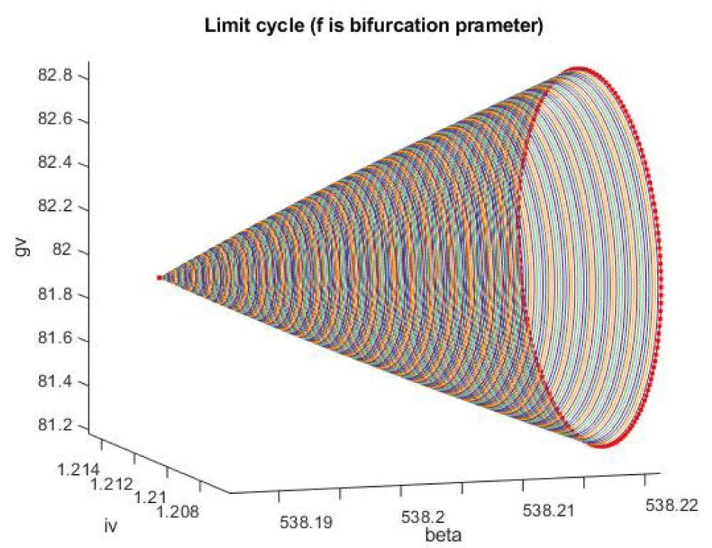 A Hopf bifurcation point is a tipping point where a system that was behaving steadily suddenly starts to oscillate or cycle on its own, like a machine that begins to vibrate instead of staying still. Hopf Bifurcation points cause limit cycles. A limit cycle is a repeating pattern of behavior that a system naturally settles into over time, like a steady heartbeat or a clock that keeps ticking. The limit point (which causes multiple steady-state solutions from a singular point enables the Multiobjective nonlinear model predictive control calculations to converge to the Utopia point (the best possible solution) in the model. Kumari, et al. [20] show that when f was the bifurcation parameter, a Hopf point was found at (gv, iv, f) values of (82.030471 538.186016, 1.210489, 0.024461). This result is confirmed and reproduced (curve AB in Figure 1d). When f is modified to f(tan(f))/0.01 the Hopf bifurcation point disappears (curve CD in Figure 1d). The limit cycle caused by this Hopf bifurcation is shown in Figure 1e.