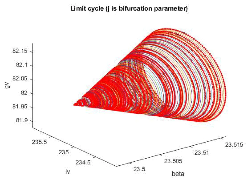 Another Hopf bifurcation point was found when j was the bifurcation parameter at (gv, iv, j) values of (82.030471, 23.497933, 234.989285, 0.285128) (curve AB in Figure 1f). When f is modified to f(tan(f))/0.01, the Hopf bifurcation point disappears (curve CD in Figure 1f). The limit cycle caused by this Hopf bifurcation is shown in Figure 1g.