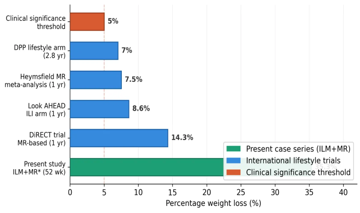 The findings complement our published cohort study (n = 702) and align with international research including the DiRECT trial, Look AHEAD study, and systematic meta-analyses supporting meal replacement strategies for weight management. ILM+MR programs offer a scalable, culturally adaptable, and cost-effective approach to addressing the obesity epidemic, with particular relevance for the Asia-Pacific region where the burden of obesity is rapidly increasing and access to specialized surgical interventions remains limited. The multi-component intervention addressing dietary, behavioral, physical activity, and psychosocial factors appears to produce synergistic effects exceeding single-component approaches.