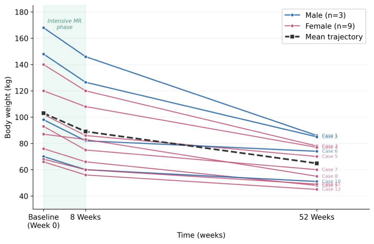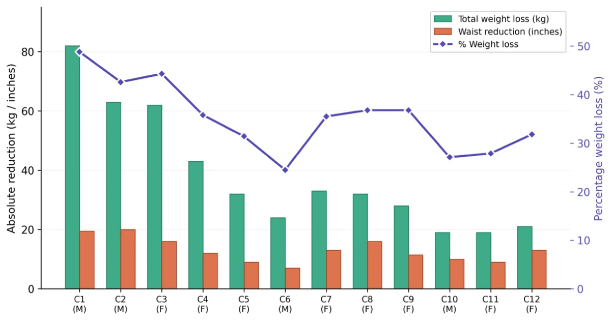 Results: Mean total weight loss was 38.2 kg (35.3% of initial body weight), with mean waist circumference reduction of 13.0 inches (33.0 cm) over 52 weeks. All 12 participants achieved clinically significant weight loss (>5%), substantially exceeding the 5–10% threshold recommended by international guidelines. Weight loss occurred in two phases: a rapid intensive phase (mean 14.0 kg during weeks 0–8) followed by continued loss during maintenance (mean 24.2 kg during weeks 8–52). All participants completed the 52-week follow-up.